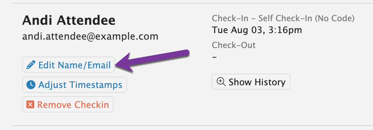 - The checkin's history will be overwritten using the new check-in time and check-out time. This means that if an attendee checked-out during the session, and re-checked-in, that information will be removed. Only the new check-in and check-out time will be present in the adjusted history.